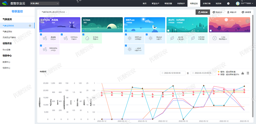 4、超限預警設置:用戶可預置常用作物報警配置,設置最低最高超限值,平臺可自動進行數(shù)據(jù)預警分析。